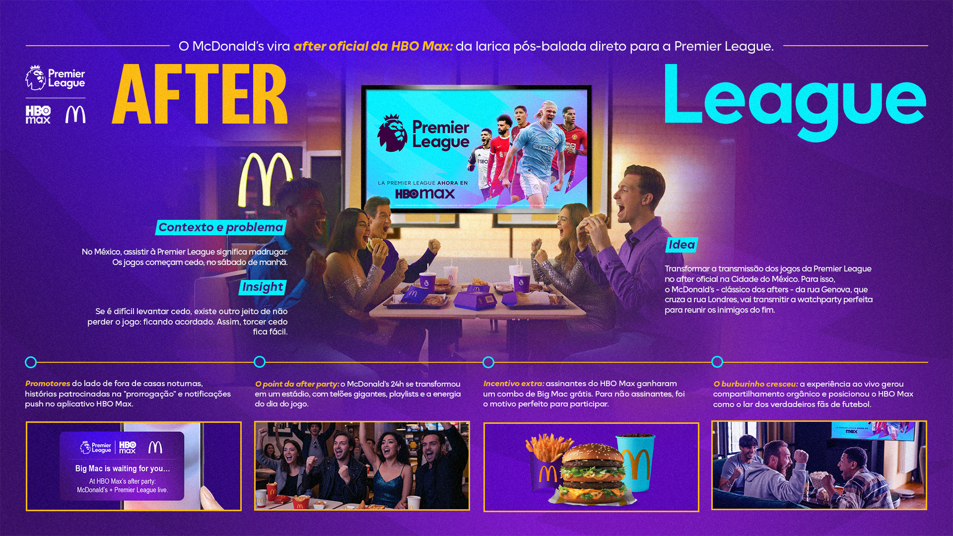 No México, as partidas da Premier League começam cedo nas manhãs de fim de semana, mas, em vez de pedir aos fãs que acordassem, a HBO Max convidou-os a não dormir. Com o After League, a primeira festa oficial pós-jogo da Premier League, um McDonald's 24 horas foi transformado em um evento esportivo com telões gigantes, playlists e a energia de um dia de jogo. A celebração durou até o apito final, posicionando a HBO Max como a casa definitiva da Premier League.